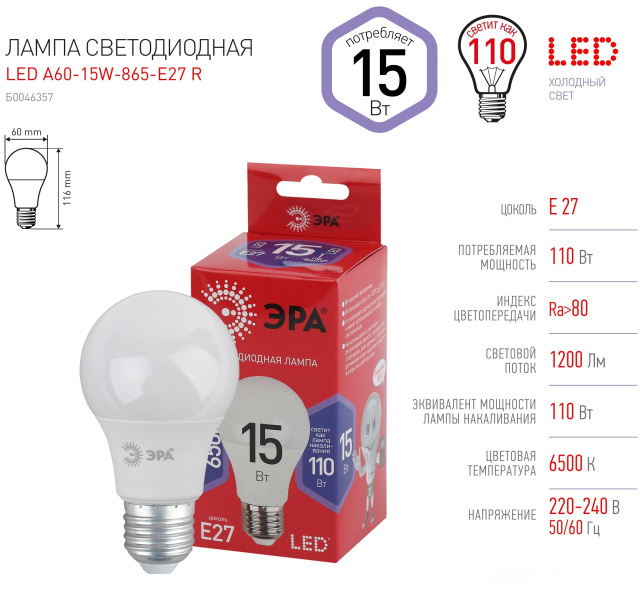 Лампа светодиодная E27 A60 15Вт 4000К "SAFFIT"