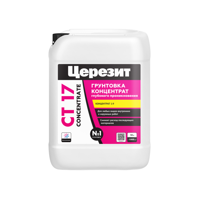 Грунтовка CT 17 Concentrate предназначена для обработки впитывающих, сильно впитывающих и непрочных оснований — цементных, известковых и гипсовых штукатурок, цементных, гипсовых и ангидритных стяжек, легкого и ячеистого бетона, кладок из керамического и силикатного кирпича, природного камня, древесностружечных и древесноволокнистых плит, гипсокартона и т.п. — перед нанесением выравнивающих штукатурных и напольных смесей, плиточных клеев, полимерных гидроизоляционных мастик, креплением систем теплоизоляции фасадов (СФТК) и т.д.